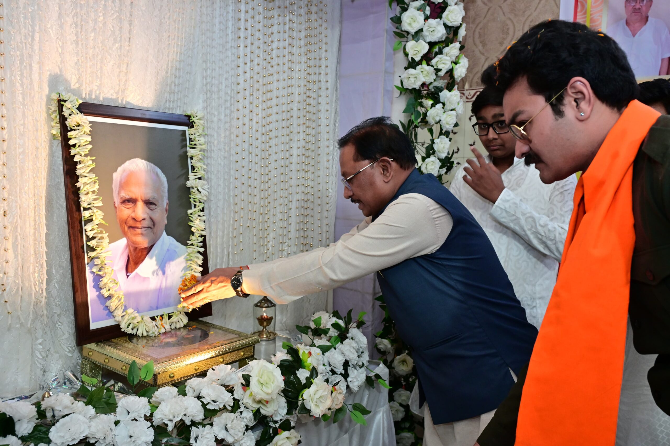 मुख्यमंत्री श्री विष्णु देव साय ने लोकतंत्र सेनानी स्वर्गीय श्री महावीर प्रसाद जैन की छायाचित्र पर पुष्प अर्पित कर श्रद्धांजलि दी