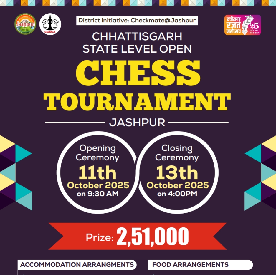 जशपुर में 11 अक्टूबर से तीन दिवसीय राज्य स्तरीय शतरंज प्रतियोगिता का होगा आयोजन, 2.51 लाख रूपयों के पुरस्कारों का होगा वितरण, पंजीयन प्रारम्भ, अंडर-09 से लेकर सीनियर सिटीजन तक विभिन्न वर्गों में प्रतिभागी प्रतियोगिता में हो सकेंगे शामिल… अधिक जाने