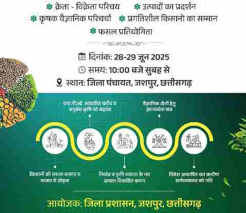 जशपुर : “कृषि क्रांति” अभियान के तहत यह दो दिवसीय सम्मेलन 28 और 29 जून को जिला पंचायत परिसर, जशपुर ...