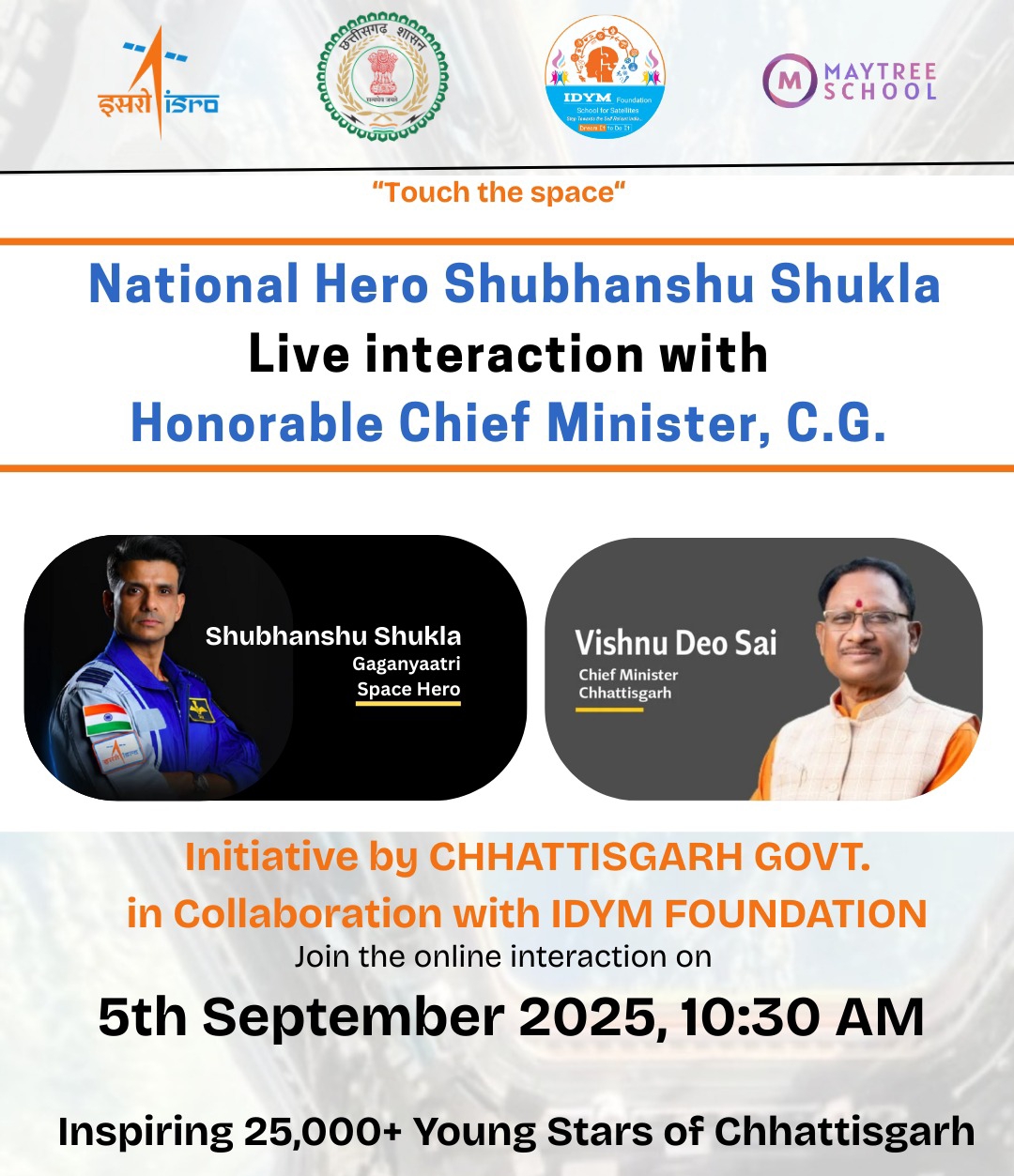 गगनयात्री शुभांशु शुक्ला के साथ मुख्यमंत्री के संवाद कार्यक्रम का जशपुर के बच्चे बनेंगे साक्षी”‘टच द स्पेस’ कार्यक्रम के माध्यम से ऑनलाइन मुख्यमंत्री से गगनयात्री होंगे रूबरू…!