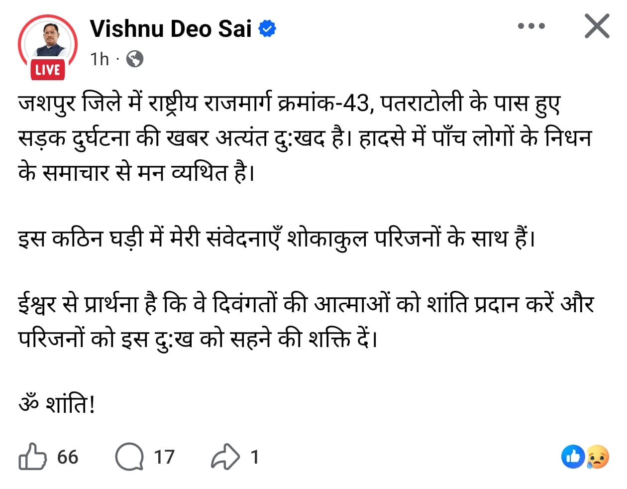 मुख्यमंत्री श्री विष्णुदेव साय ने पतराटोली के पास हुए सड़क दुर्घटना पर जताया गहरा दुःख ,राष्ट्रीय राजमार्ग-43 पर हादसे में पाँच लोगों की मृत्यु , शोकाकुल परिजनों के प्रति गहरी संवेदनाएँ व्यक्त की