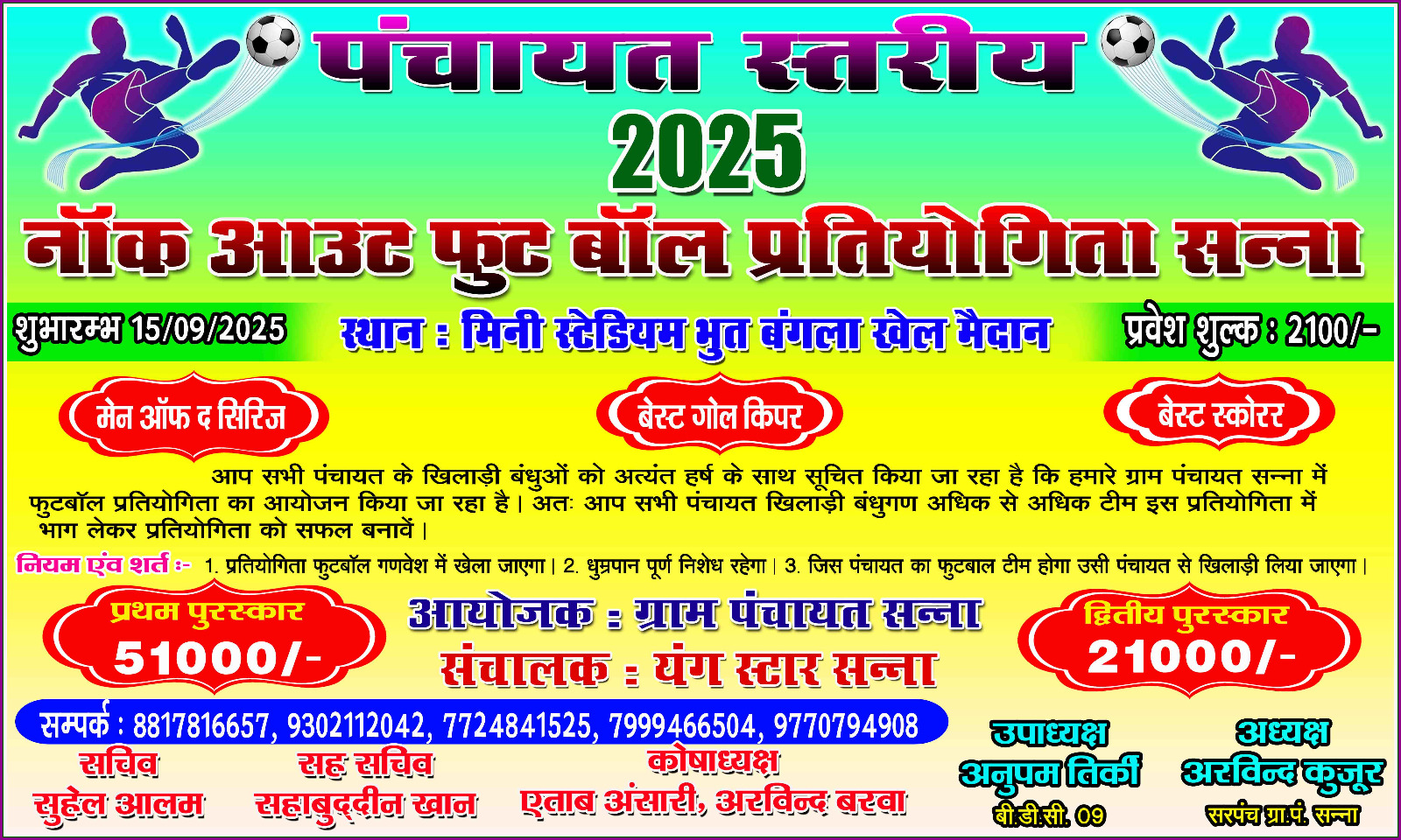 जशपुर: यंग स्टार समिति के तहत सन्ना में पंचायत स्तरीय नॉक आउट फुटबॉल प्रतियोगिता का भव्य आयोजन ” 15 सितंबर को विधायक श्रीमती रायमुनी भगत करेंगी शुभारंभ “प्रथम पुरस्कार 51000₹” खेल के नियम कुछ अलग…… जानिए भाग लेने की पूरी प्रक्रिया
