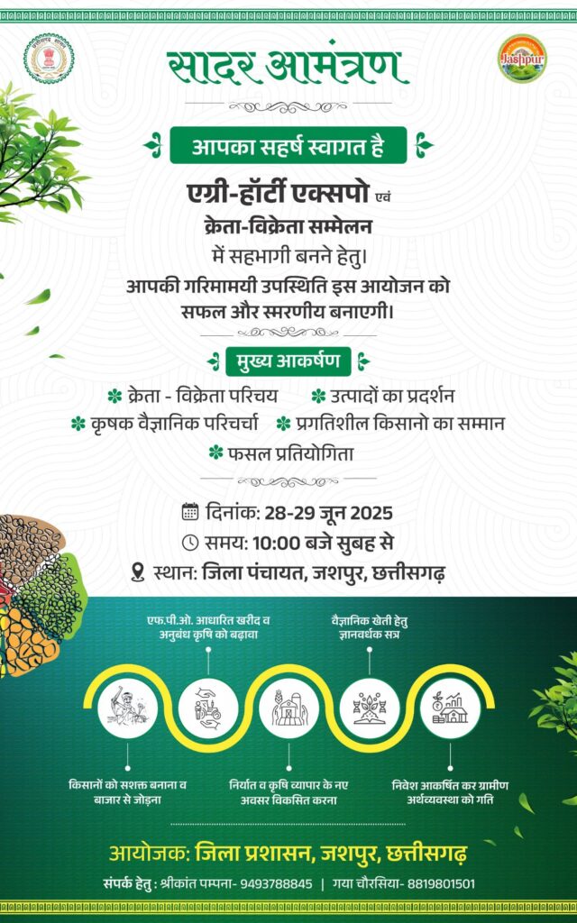 जशपुर : “कृषि क्रांति” अभियान के तहत यह दो दिवसीय सम्मेलन 28 और 29 जून को जिला पंचायत परिसर, जशपुर में आयोजित होगा, जिसका उद्देश्य जिले के किसानों को राष्ट्रीय स्तर पर बाजार से जोड़ते हुए उनके उत्पादों को बेहतर दाम दिलाना है। जशपुर जिले में कृषि, उद्यानिकी और रेशम उत्पादन को प्रोत्साहन देने हेतु जिला प्रशासन द्वारा पहली बार एग्री-हॉटी क्रेता-विक्रेता सम्मेलन 2025 का आयोजन किया जा रहा है।