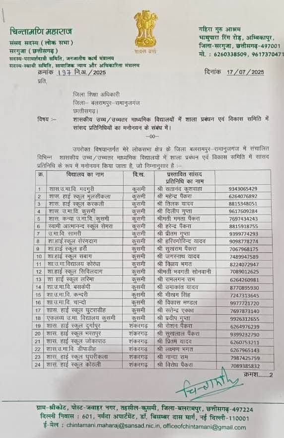 बलरामपुर:- सांसद चिंतामणि महाराज ने शासकीय उच्य/उच्चतर माध्यमिक विद्यालयों में शाला प्रबंधन एवं विकास समिति में सांसद प्रतिनिधियों का मनोनयन किया है ।