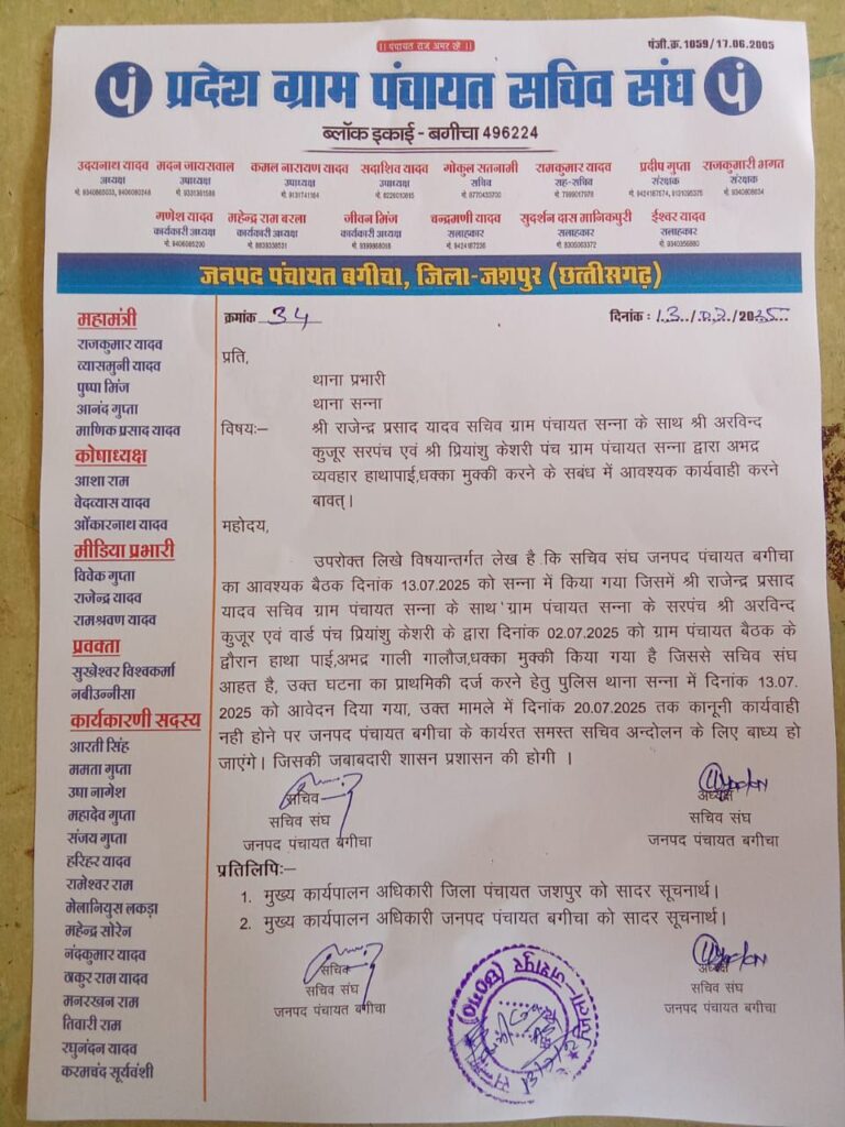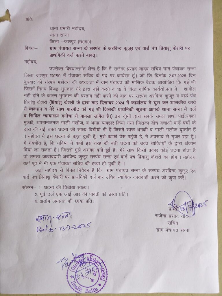 थाने में प्रस्तुत आवेदन में लेख है कि मैं राजेंद्र प्रसाद यादव सन्ना जिला जशपुर छ०ग० में पंचायत सचिव के पद पर कार्यरत हूँ। जो कि दिनांक 2.07.2025 दिन बुधवार को संरपंच महोदय की अध्यक्षता में ग्राम पंचायत की मासिक बैठक आयोजित कि गई थी जिसमें निमय विरूद्ध भुगतान मेरे द्वारा नही करने व 15 वें वित्त वार्षिक कार्ययोजना में शामील नही होने के कारण भुगतान की प्रस्ताव नही करने की बात पर सरपंच अरविन्द कुजूर व वार्ड पंच प्रियांशु केशरी (प्रियांशु केशरी के द्वारा माह दिसम्बर 2024 में भी कार्यालय में घुस कर शासकीय कार्य में व्यवधान व मेरे साथ मारपीट की गई थी जिसकी प्राथमिकी सूचना आपके थाना सन्ना में दर्ज व सिविल न्यायालय बगीचा में मामला लंबित है।)