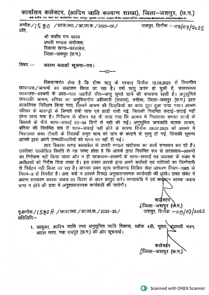 जशपुर 10 जुलाई 25/ कलेक्टर श्री रोहित व्यास ने ठाकुर दयाल सिंह, शिक्षक (एल.बी.), प्रभारी अधीक्षक, शासकीय अनुसूचित जनजाति बालक आश्रम, बगिया, विकास खण्ड-कांसाबेल, जिला-जशपुर के द्वारा कक्षा तीसरी में अध्ययनरत छात्र अमृत साय के सर्प दंश की सूचना उच्चाधिकारियों को विलम्ब से दिया गया। परिसर की देख-रेख करने में लापरवाही बरती गई। नियमित रूप से परिसर की साफ-सफाई नहीं कराई गई। छात्र के ईलाज में देरी की गई जिसके कारण छात्र का निधन हो गया।