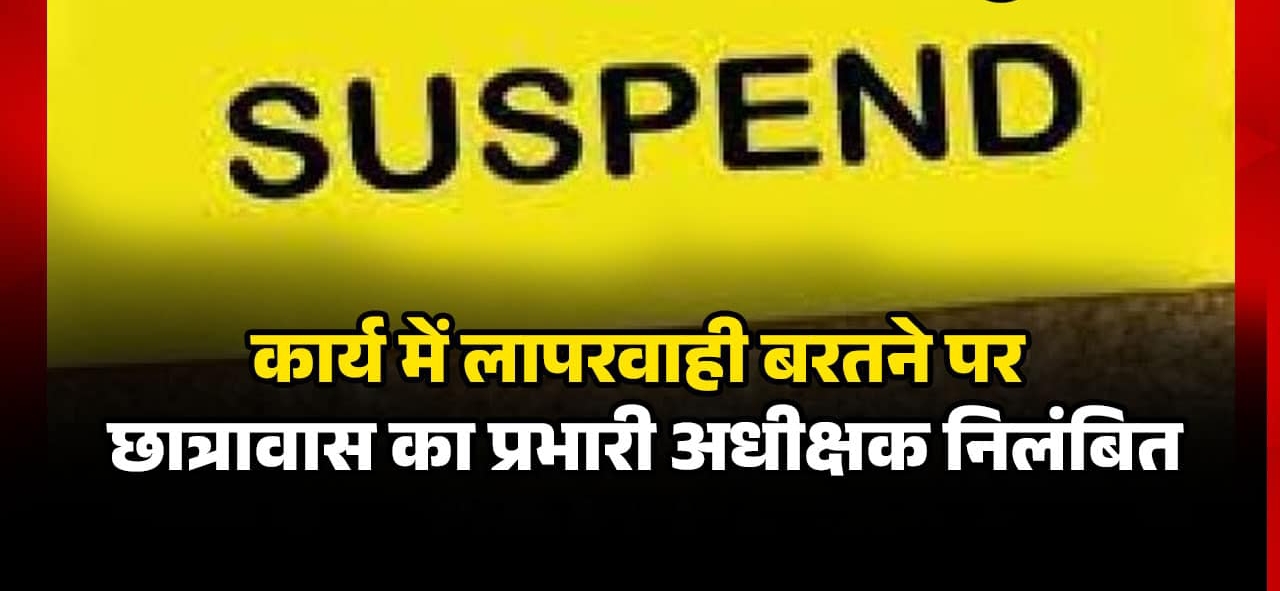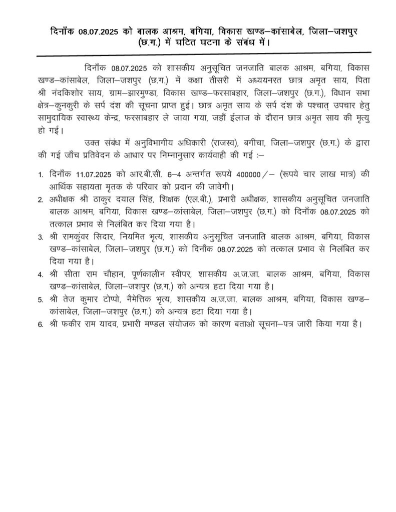 अतः कर्त्तव्य के प्रति उदासीनता एवं लापरवाही बरते जाने के आरोप में छ.ग. सिविल सेवा (वर्गीकरण, नियंत्रण तथा अपील) नियम 1966 के नियम-9 (1) (क) के तहत् श्री ठाकुर दयाल सिंह, शिक्षक (एल.बी.), प्रभारी अधीक्षक, शासकीय अनुसूचित जनजाति बालक आश्रम, बगिया, विकास खण्ड-कांसाबेल, जिला-जशपुर (छ.ग.) को तत्काल प्रभाव से निलंबित किया जाता है। साथ ही यहां के नियमित कर्मचारी को भी निलंबित की कार्यवाही की गई है,वहीं मंडल संयोजक फकीर यादव को कारण बताओ नोटिस जारी कर जवाब मांगा है।