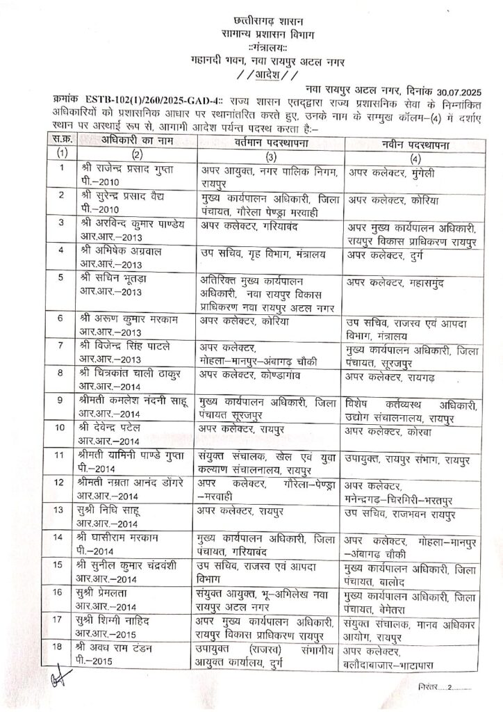 Breaking Jashpur: बड़े पैमाने पर प्रशासनिक अधिकारियों का तबादला…. देखें सूची 30 July 2025 by Samvad Chhattisgarh Desk बड़े पैमाने पर प्रशासनिक अधिकारियों का तबादला…. देखें सूची SAS Transfer Order Date 30.07.25Download Please Share With Your Friends Also Samvad Chhattisgarh Desk संवाद छत्तीसगढ़ न्यूज़ पोर्टल बदलते भारत की सबसे विश्वसनीय न्यूज़ पोर्टल है। सबसे सटिक और सबसे तेज समाचार का अपडेट पाने के लिए जुडिए हमारे साथ" टीम :- Samvad Chhattisgarh ...