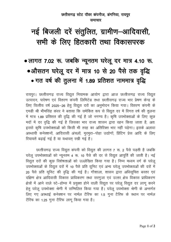 छत्तीसगढ़ स्टेट पॉवर कंपनीज, डंगनिया, नई बिजली दरें संतुलित, ग्रामीण- आदिवासी, सभी के लिए हितकारी तथा विकासपरक”लागत 7.02 रू. जबकि न्यूनतम घरेलू दर मात्र 4.10 रू.औसतन घरेलू दर में मात्र 10 से 20 पैसे तक वृद्धि