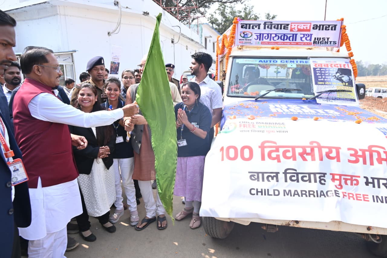 जशपुरनगर 5 फरवरी 2026/ बाल विवाह के विरुद्ध जन-जागरूकता को राज्य के अंतिम छोर तक पहुँचाने और छत्तीसगढ़ को पूर्णतः बाल विवाह मुक्त बनाने के उद्देश्य से मुख्यमंत्री श्री विष्णु देव साय ने आज बगिया से बाल विवाह मुक्ति रथ को हरी झंडी दिखाकर रवाना किया। यह रथ 8 मार्च तक प्रदेश के विभिन्न गांवों और कस्बों में भ्रमण कर बाल विवाह के दुष्परिणामों के प्रति लोगों को जागरूक करेगा। इस दौरान मुख्यमंत्री श्री साय बाल विवाह चलाए जा रहे हस्ताक्षर अभियान में भी शामिल हुए। यह पहल 100 दिवसीय राष्ट्रव्यापी गहन जागरूकता अभियान के अंतर्गत संचालित की जा रही है। जिले में यह अभियान समर्पित सेंटर फॉर पावर्टी एलिविएशन एंड सोशल रिसर्च द्वारा, बाल अधिकारों के लिए कार्यरत देशव्यापी नेटवर्क जस्ट राइट्स फॉर चिल्ड्रेन के सहयोग से चलाया जा रहा है।