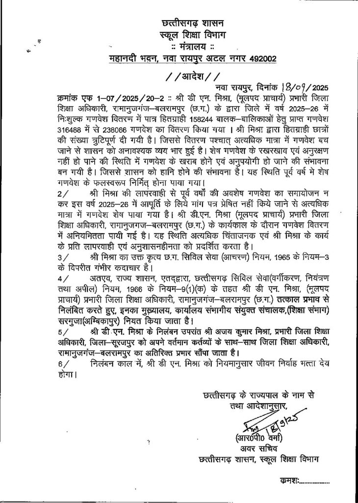 बलरामपुर : डी एन. मिश्रा, (मूलपद प्राचार्य) प्रभारी जिला शिक्षा अधिकारी, रामानुजगंज-बलरामपुर (छ.ग.) के द्वारा जिले में वर्ष 2025-26 में निःशुल्क गणवेश वितरण में हितग्राही छात्रों की संख्या त्रुटिपूर्ण दी गयी है। जिससे वितरण पश्चात् अत्यधिक मात्रा में गणवेश बच जाने से शासन को अनावश्यक व्यय भार हुई है। शेष गणवेश के रखरखाव एवं अनुरक्षण नहीं हो पाने की स्थिति में गणवेश के खराब होने एवं अनुपयोगी हो जाने की संभावना बन गयी है। जिससे शासन को हानि होने की संभावना है।