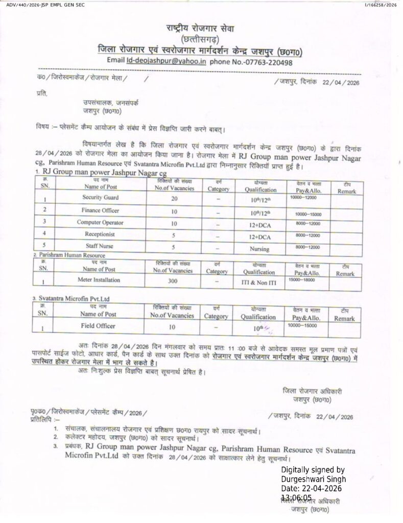 रोजगार मेले में RJ Group man power Jashpur Nagar अंतर्गत 50 पदों में भर्ती होनी है, जिनमें सिक्योरिटी गार्ड हेतु 20 पद योग्यता 10 वीं व 12 वी, फाइनेंस ऑफिसर के 10 पद योग्यता 10 वीं व 12 वी, कम्प्यूटर ऑपरेटर के 10 पद योग्यता 12 वीं के साथ डीसीए, रिसेपनिस्ट के 5 पद योग्यता 12 वीं के साथ डीसीए और स्टाफ नर्स के 5 पदों के लिए योग्यता नर्सिंग होना आवश्यक हैं। इसी तरह Parishram Human Resource में मीटर इंस्टालेशन के लिए 300 पदों में भर्ती होनी है, इसके लिए योग्यता आईटीआई और नॉन आईटीआई मांगी गई है। Svatantra Microfin Pvt.Ltd में फ़ील्ड ऑफिसर के 10 पदों के लिए योग्यता 10 वीं पास निर्धारित है। जिला प्रशासन ने अधिक से अधिक युवाओं से इस रोजगार मेले में भाग लेकर अवसर का लाभ उठाने की अपील की है।