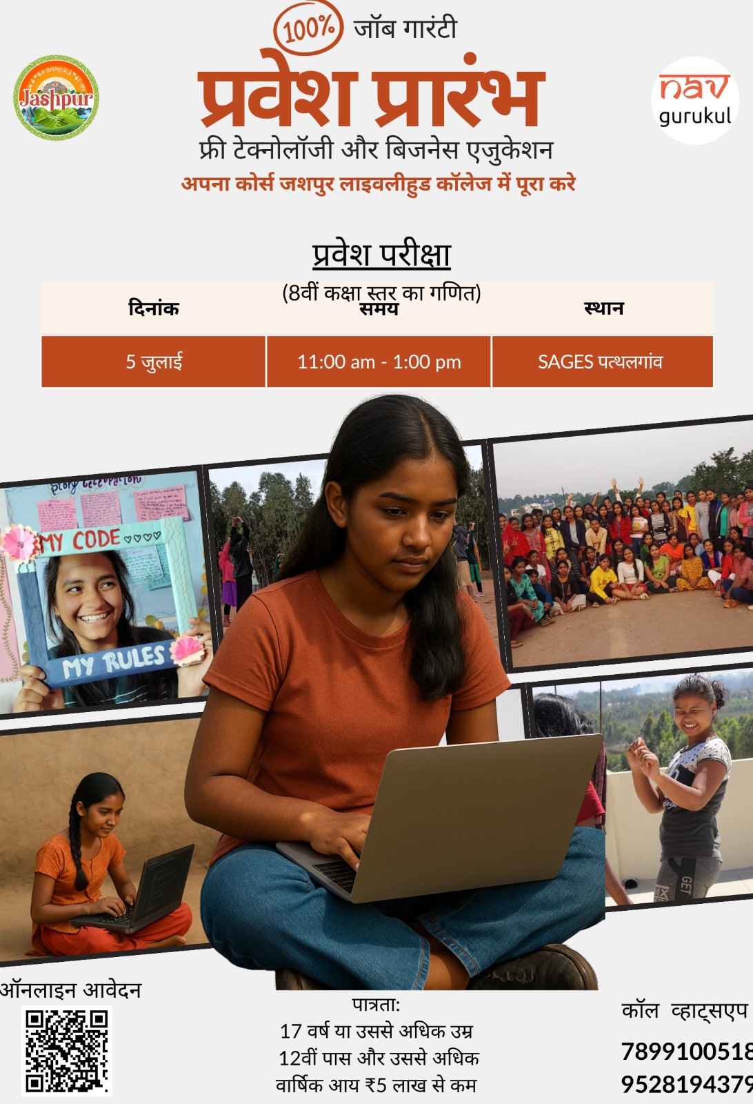 शिक्षा और कौशल विकास के क्षेत्र में नवाचार की श्रृंखला को आगे बढ़ाते हुए, जशपुर जिला प्रशासन ने NavGurukul फाउंडेशन के सहयोग से जिले की युवतियों को एक सुनहरा अवसर प्रदान किया है। स्थानीय प्रतिभाशाली युवतियों को डिजिटल दुनिया से जोड़ने और उन्हें रोजगारोन्मुखी तकनीकी एवं व्यावसायिक कौशल प्रदान करने के उद्देश्य से, यह शैक्षणिक सत्र 2025–26 के लिए प्रवेश प्रक्रिया प्रारंभ की गई है। यह कार्यक्रम पूर्णतः निःशुल्क एवं आवासीय है, जिसमें छात्राओं को कंप्यूटर प्रोग्रामिंग, व्यवसायिक और पेशेवर कौशलों का व्यावहारिक प्रशिक्षण दिया जाएगा।