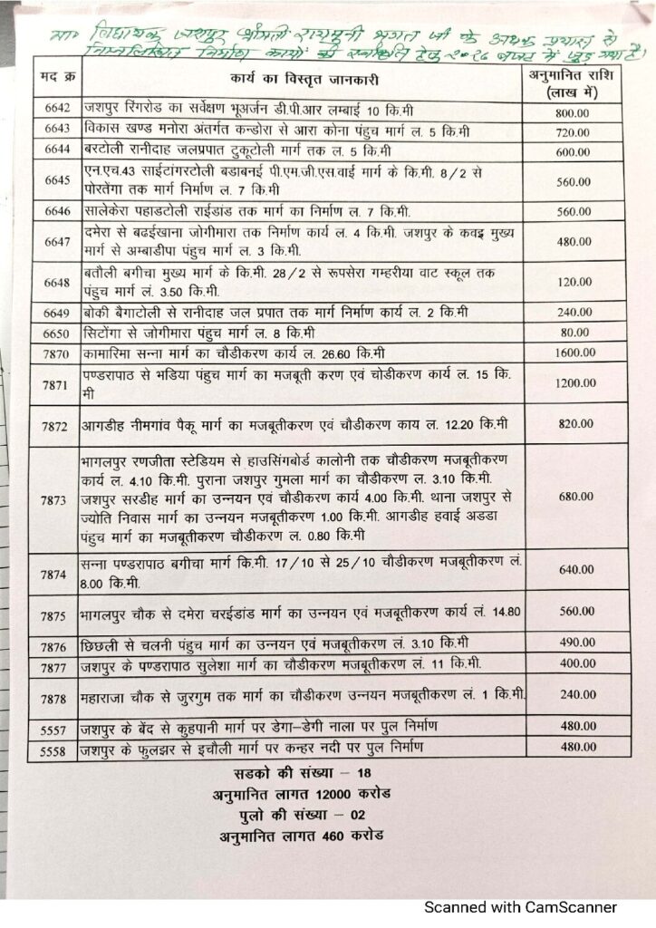 ज्ञात हो कि जशपुर विधानसभा क्षेत्र की तेज तर्रार विधायक श्रीमती रायमुनी भगत के अथक प्रयास एवं मेहनत से विष्णु सरकार ने  2026-27 के बजट में 12460 करोड़ रुपए के विकास कार्यों का सौगात जशपुर विधानसभा क्षेत्र को दिया है,जशपुर विधायक श्रीमती रायमुनी भगत ने क्षेत्रवासियों की मांग पर बहुप्रतीक्षित विकास कार्यों को राज्य सरकार के पास भेज मांग किया था,उक्त कार्यों को विष्णु सरकार ने गंभीरता से लेते हुवे बजट में शामिल किया है,24 फरवरी को पेश हुवे बजट में वित्त मंत्री ओपी चौधरी ने इन सौगातों का घोषणा भी किया।जशपुर विधायक के प्रयास से जशपुर रिंगरोड का सर्वेक्षण भूअर्जन डी.पी.आर लम्बाई 10 कि.मी अनुमानित लागत 800.00 लाख रुपए,विकास खण्ड मनोरा अंतर्गत कन्डोरा से आरा कोना पंहुच मार्ग ल. 5 कि.मी अनुमानित लागत 720.00 लाख रुपए,बरटोली रानीदाह जलप्रपात टुकूटोली मार्ग तक ल. 5 कि.मी 600.00 लाख रुपए,एन.एच.43 साईटांगरटोली बडाबनई पी.एम.जी.एस.वाई मार्ग के कि.मी. 8/2 से पोरतेंगा तक मार्ग निर्माण ल. 7 कि. मी अनुमानित लागत 560.00 लाख रुपए,सालेकेरा पहाडटोली राईडांड तक मार्ग का निर्माण ल. 7 कि.मी.अनुमानित लागत 560.00 रुपए,दमेरा से बढईखाना जोगीमारा तक निर्माण कार्य ल. 4 कि.मी. जशपुर के कवइ मुख्य मार्ग से अम्बाडीपा पंहुच मार्ग ल. 3 कि.मी.अनुमानित लागत 480.00 लाख रुपए,बतौली बगीचा मुख्य मार्ग के कि.मी. 28/2 से रूपसेरा गम्हरीया वाट स्कूल तक पंहुच मार्ग लं. 3.50 कि.मी. अनुमानित लागत 120.00 लाख रुपए,बोकी बैगाटोली से रानीदाह जल प्रपात तक मार्ग निर्माण कार्य ल. 2 कि.मी अनुमानित राशि 240.00 लाख रुपए,सिटोंगा से जोगीमारा पंहुच मार्ग ल. 8 कि.मी अनुमानित राशि 80.00 लाख रुपए,कामारिमा सन्ना मार्ग का चौडीकरण कार्य ल. 26.60 कि.मी अनुमानित राशि 1600.00 लाख रुपए,पण्डरापाठ से भडिया पंहुच मार्ग का मजबूती करण एवं चोडीकरण कार्य ल. 15 कि. मी अनुमानित राशि 1200.00 लाख रुपए,आगडीह नीमगांव पैकू मार्ग का मजबूतीकरण एवं चौडीकरण काय ल. 12.20 कि.मी अनुमानित राशि 820.00 लाख रुपए,भागलपुर रणजीता स्टेडियम से हाउसिंगबोर्ड कालोनी तक चौडीकरण मजबूतीकरण कार्य ल. 4.10 कि.मी.,पुराना जशपुर गुमला मार्ग का चौडीकरण ल. 3.10 कि.मी. जशपुर सरडीह मार्ग का उन्नयन एवं चौडीकरण कार्य 4.00 कि.मी. थाना जशपुर से ज्योति निवास मार्ग का उन्नयन मजबूतीकरण 1.00 कि.मी. आगडीह हवाई अडडा पंहुच मार्ग का मजबूतीकरण चौडीकरण ल. 0.80 कि.मी अनुमानित राशि 680.00 लाख रूपये,सन्ना पण्डरापाठ बगीचा मार्ग कि.मी. 17/10 से 25/10 चौडीकरण मजबूतीकरण लं. 8.00 कि.मी.अनुमानित राशि 640.00 लाख रुपए,भागलपुर चौक से दमेरा चरईडांड मार्ग का उन्नयन एवं मजबूतीकरण कार्य लं. 14.80 अनुमानित राशि 560.00 लाख रूपये,छिछली से चलनी पंहुच मार्ग का उन्नयन एवं मजबूतीकरण लं. 3.10 कि.मी अनुमानित राशि 490.00 लाख रुपए,जशपुर के पण्डरापाठ सुलेशा मार्ग का चौड