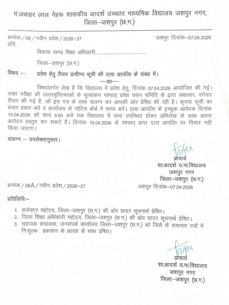 दावा-आपत्ति प्रस्तुत करने के इच्छुक आवेदक दिनांक 10 अप्रैल 2026 को शाम 5:00 बजे तक आवश्यक अभिलेखों सहित विद्यालय में स्वयं उपस्थित होकर आवेदन प्रस्तुत कर सकते हैं। निर्धारित तिथि एवं समय के पश्चात् प्राप्त किसी भी दावा-आपत्ति पर विचार नहीं किया जाएगा। अभ्यर्थियों की सुविधा हेतु प्रावीण्य सूची पं. जवाहरलाल नेहरू शासकीय आदर्श उच्चतर माध्यमिक विद्यालय तथा समस्त विकासखंड शिक्षा अधिकारी कार्यालयों में चस्पा की गई है। साथ ही अभ्यर्थी सूची को विद्यालय की वेबसाइट https://govtmodelhssjashpur.in पर जाकर भी देख सकते हैं।