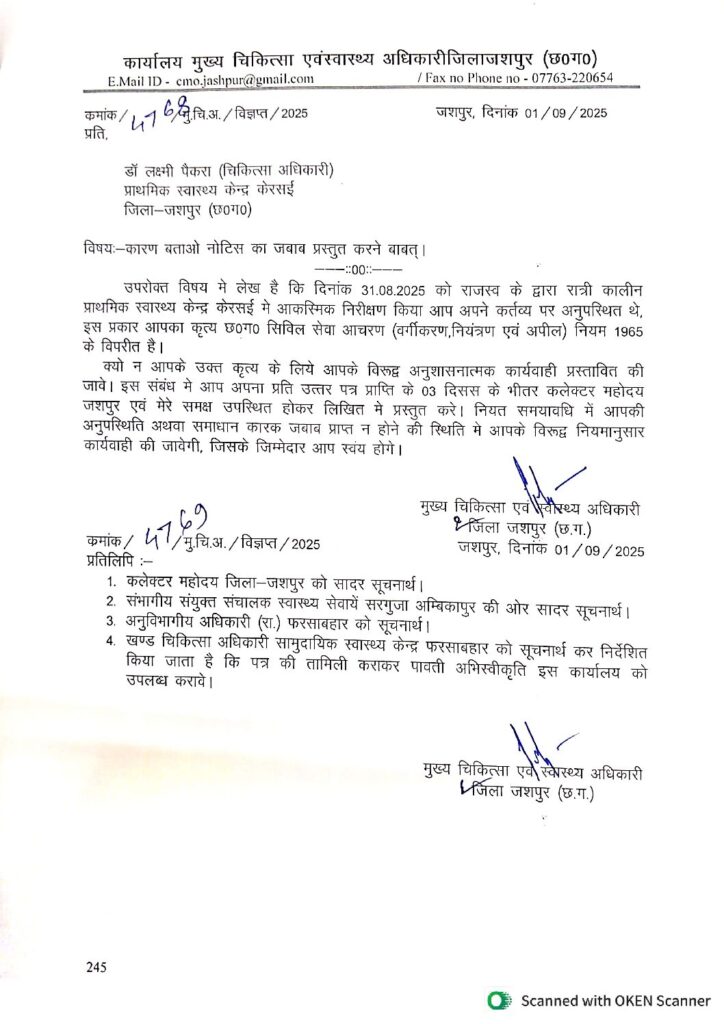 इसके तहत प्राथमिक स्वास्थ्य केंद्र केसरई के निरीक्षण के दौरान अपने कार्यक्षेत्र में अनुपस्थित होने की वजह से चिकित्सा अधिकारी डॉ. लक्ष्मी पैंकरा को कारण बताओ नोटिस दिया गया है। इसी तरह सामुदायिक स्वास्थ्य केंद्र फरसाबहार के बीएमओ डॉ. विनय भगत को स्वास्थ्य केंद्र में अव्यवस्था पाए जाने पर कारण बताओ नोटिस, प्राथमिक स्वास्थ्य केंद्र तमता के चिकित्सा अधिकारी डॉ. प्रवीण किण्डो को कार्यक्षेत्र में अनुपस्थित रहने की वजह से कारण बताओ नोटिस और प्राथमिक स्वास्थ्य केंद्र मैनी के चिकित्सा अधिकारी डॉ. अदिति मोना टोप्पो को स्वास्थ्य केंद्र बंद पाए जाने पर कारण बताओ नोटिस, सामुदायिक स्वास्थ्य केंद्र सन्ना के होम्योपैथिक चिकित्सा अधिकारी डॉ. श्यामवती भगत, चिकित्सा अधिकारी डॉ. नीतीश आनंद सोनवानी और डॉ. कृष्णा गुप्ता को अपने कार्यक्षेत्र में अनुपस्थित रहने की वजह से कारण बताओ नोटिस जारी किया गया है।