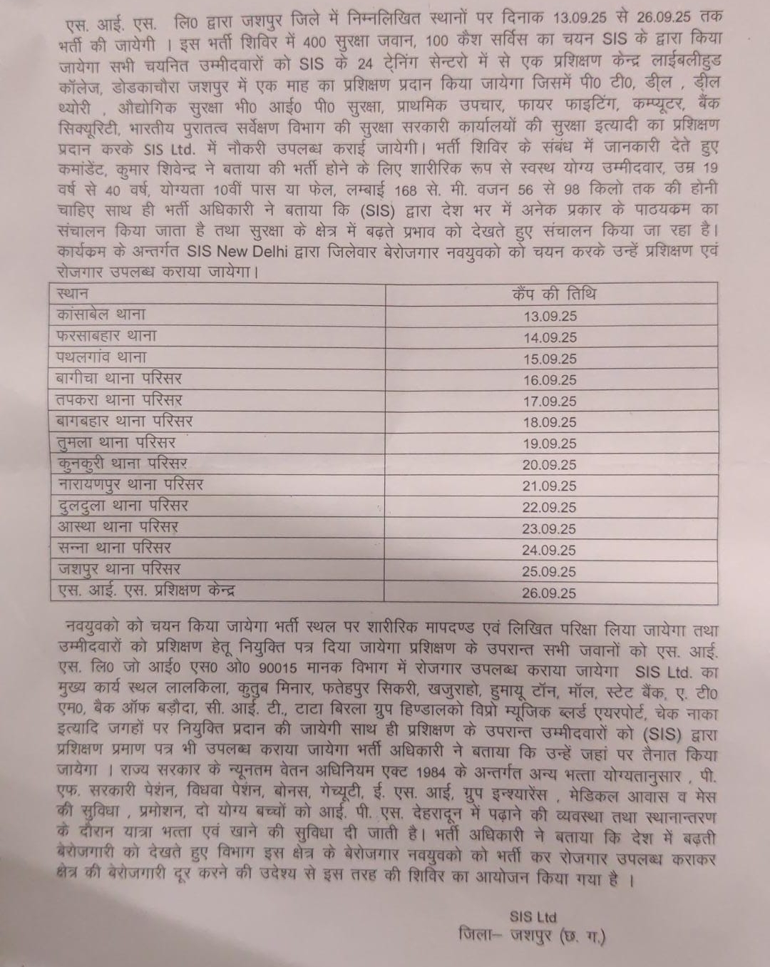 नारायणपुर थाना परिसर, दुलदुला थाना परिसर, आस्था थाना परिसर, सन्ना थाना परिसर, जशपुर थाना परिसर एवं एस. आई. एस. प्रशिक्षण केन्द्र में शिवर का आयोजन किया जाएगा। इस भर्ती शिविर में 400 सुरक्षा जवान, 100 कैश सर्विस का चयन एसआईएस के द्वारा किया जायेगा। सभी चयनित उम्मीदवारों को एसआईएस के 24 ट्रेनिंग सेन्टरों में से एक प्रशिक्षण केन्द्र लाईबलीहुड कॉलेज, डोडकाचौरा जशपुर में एक माह का प्रशिक्षण प्रदान किया जायेगा। जिसमें पी. टी., डील, डील थ्योरी, औद्योगिक सुरक्षा भी आई.पी.सुरक्षा, प्राथमिक उपचार, फायर फाइटिंग, कम्प्यूटर, बैंक सिक्यूरिटी, भारतीय पुरातत्व सर्वेक्षण विभाग की सुरक्षा सरकारी कार्यालयों की सुरक्षा इत्यादी का प्रशिक्षण प्रदान करके एसआईएस लि. में नौकरी उपलब्ध कराई जायेगी।