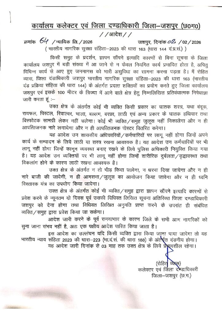 जशपुरनगर, 06 फरवरी 2026/ जिले में शासकीय कार्यों की सुचारु व्यवस्था एवं कानून-व्यवस्था बनाए रखने के उद्देश्य से जिला प्रशासन ने कड़ा कदम उठाया है। कलेक्टर एवं जिला दण्डाधिकारी श्री रोहित व्यास द्वारा भारतीय नागरिक सुरक्षा संहिता-2023 की धारा 163 (पूर्व धारा 144) के अंतर्गत जिला कार्यालय जशपुर एवं उसके 100 मीटर त्रिज्या क्षेत्र में प्रतिबंधात्मक आदेश जारी किया गया है।