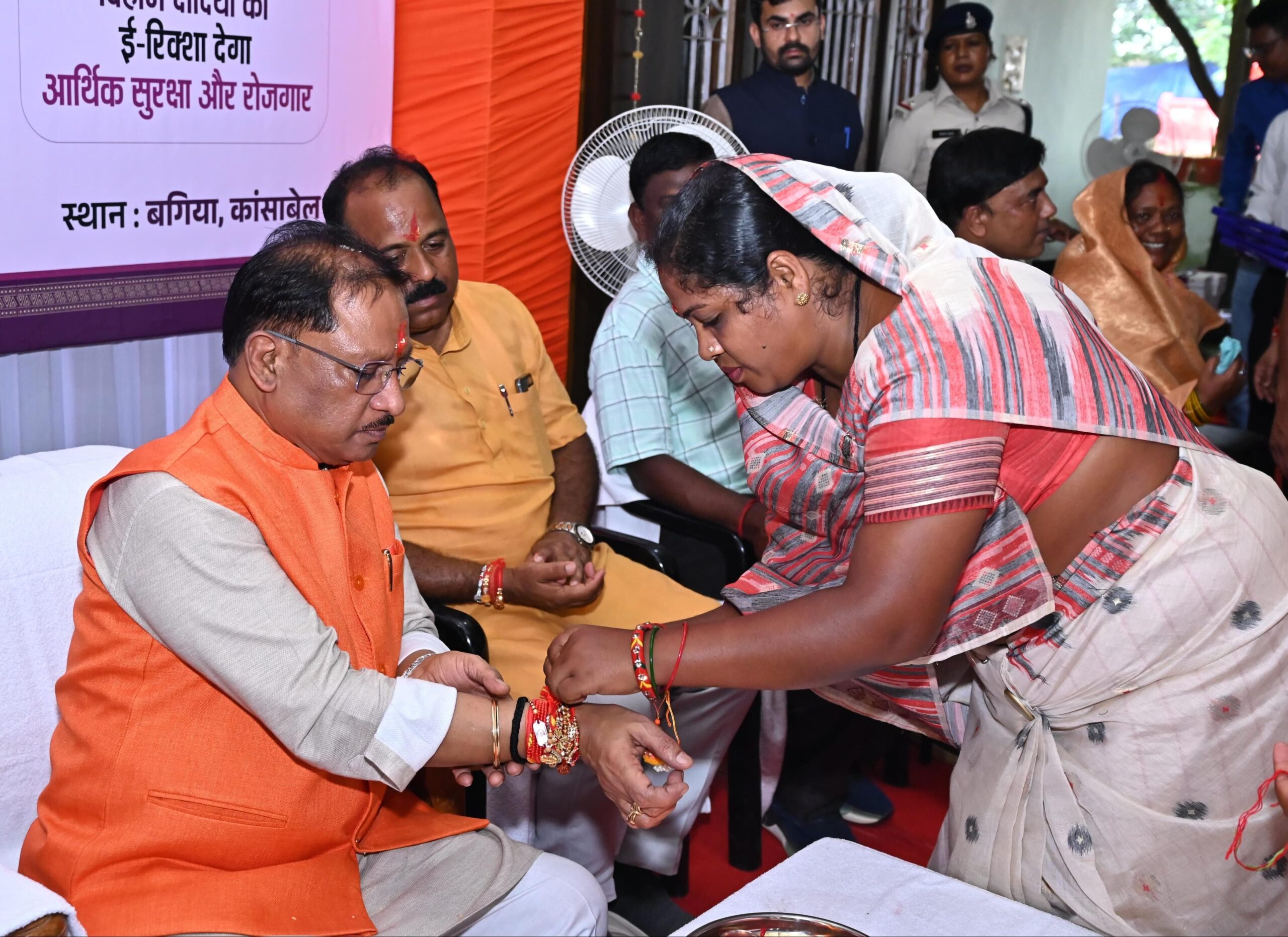 रायपुर 09 अगस्त 2025/मुख्यमंत्री श्री विष्णु देव साय के गृह ग्राम बगिया स्थित कैंप कार्यालय में रक्षाबंधन के अवसर पर विभिन्न योजनाओं से लाभान्वित बहनों ने राखी बांधकर आभार व्यक्त किया। प्रधानमंत्री आवास योजना, महतारी वंदन योजना की हितग्राही दीदियों के साथ आंगनबाड़ी कार्यकर्ता-सहायिकाएँ, मितानिन और स्व-सहायता समूह की बहनों ने भी मुख्यमंत्री श्री साय की कलाई पर राखी बांधी और उनके दीर्घायु की कामना की।