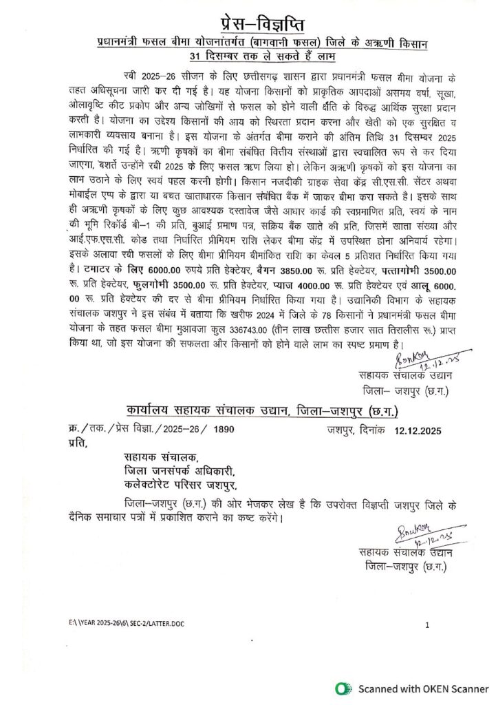 जशपुरनगर 13 दिसम्बर 2025/छत्तीसगढ़ शासन द्वारा प्रधानमंत्री फसल बीमा योजना के तहत रबी 2025-26 सीजन के लिए अधिसूचना जारी कर दी गई है। यह योजना किसानों को प्राकृतिक आपदाओं असमय वर्षा, सूखा, ओलावृष्टि कीट प्रकोप और अन्य जोखिमों से फसल को होने वाली क्षति के विरुद्ध आर्थिक सुरक्षा प्रदान करती है। योजना का उद्देश्य किसानों की आय को स्थिरता प्रदान करना और खेती को एक सुरक्षित व लाभकारी व्यवसाय बनाना है।