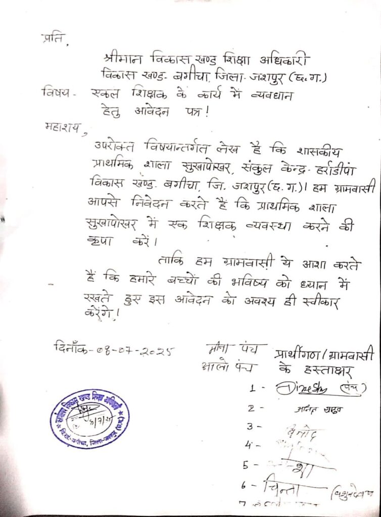 विकास खंड शिक्षा अधिकारी को दिए गए आवेदन में ग्रामीणों ने बताया है कि शासकीय प्राथमिक शाला सुखापोखर, संकुल केन्द्र- हर्राडीपा विकास खण्ड. बगीचा, जि. जशपुर (छ.ग.)। हम ग्रामवासी आपसे निवेदन करते हैं कि प्राथमिक शाला सुखापोखर में एक शिक्षक व्यवस्था करने की कृपा करें।